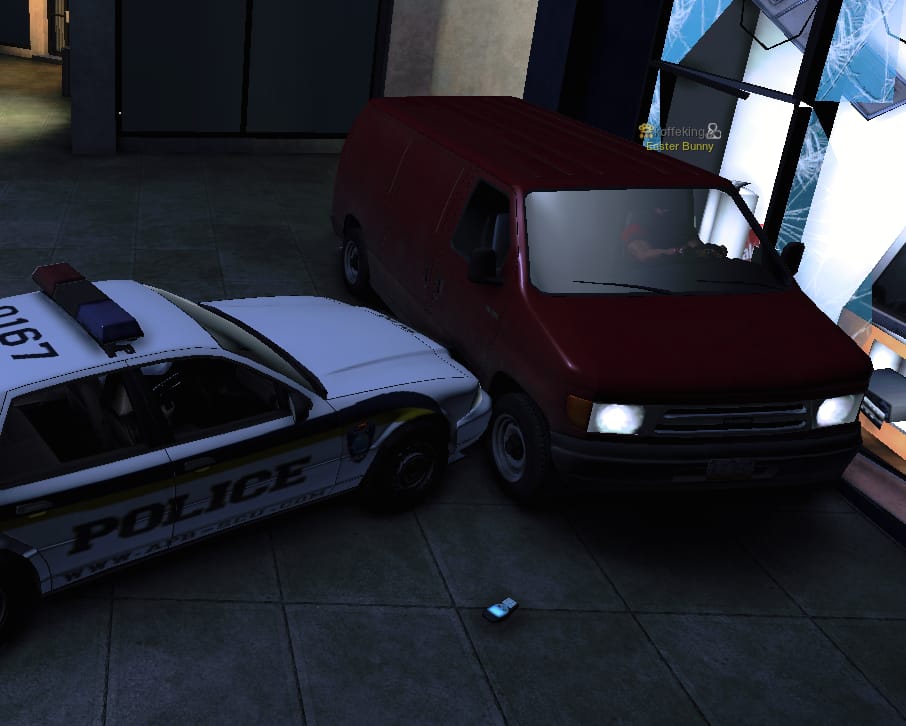 Even if they aren’t in the vehicle anymore, in many cases you can still ram their vehicle into a window or garage and cause it to break. Once this happens, handcuffs will pop up over the head of the criminal, and you will be able to witness them. (Assuming they have $100 or more in cash and/or items)
